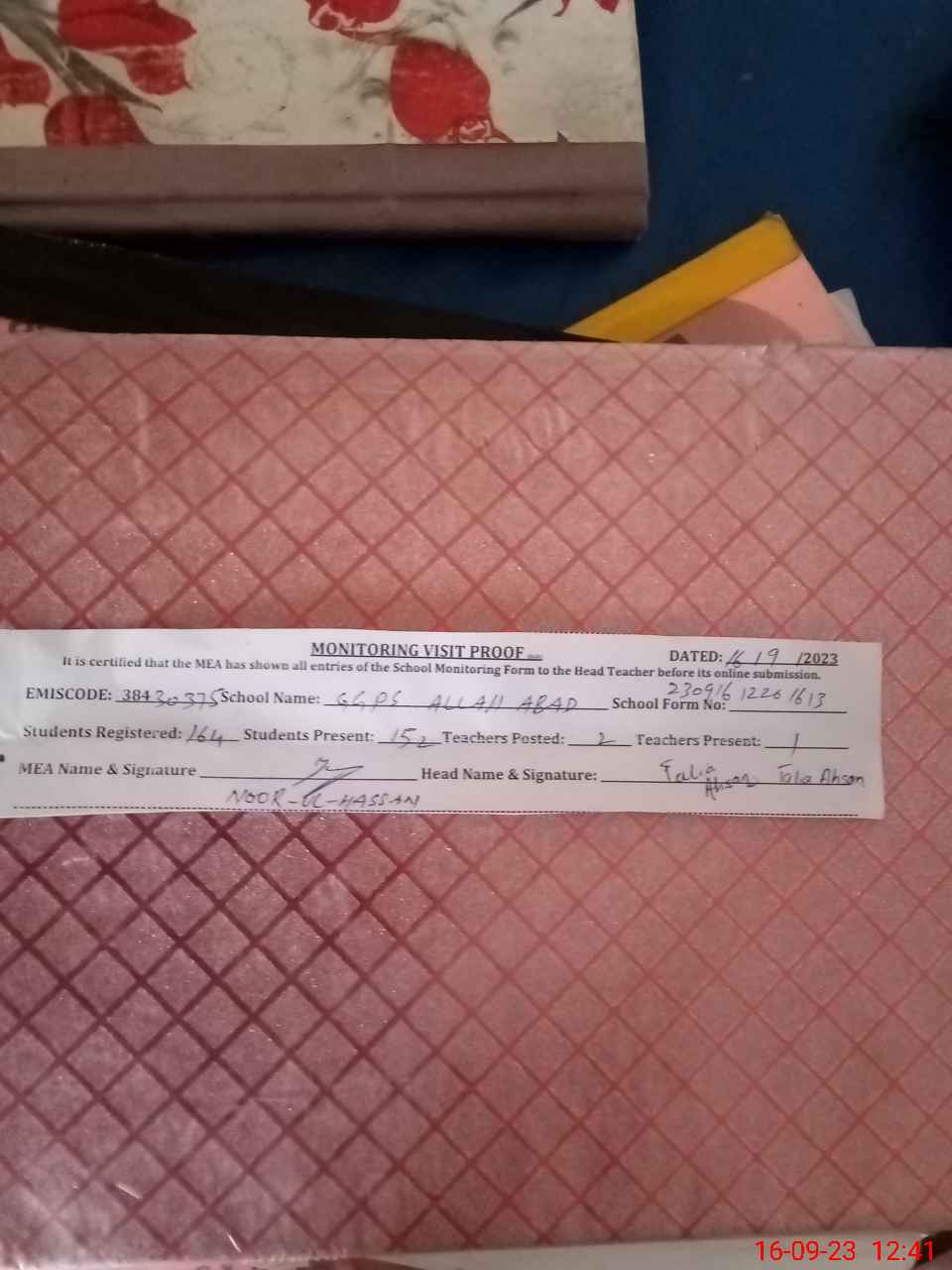 | EMIS Code: 38430375 | Name of School: GGPS ALLAH ABAD | |||