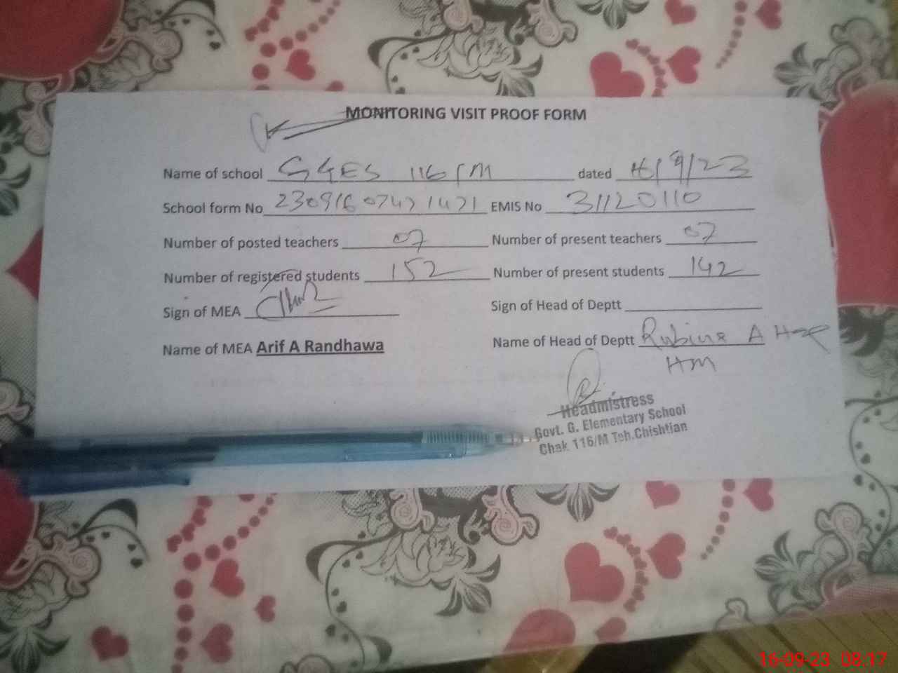 | Attendance Register | Head Teacher | MEA with School | Visit Proof |
