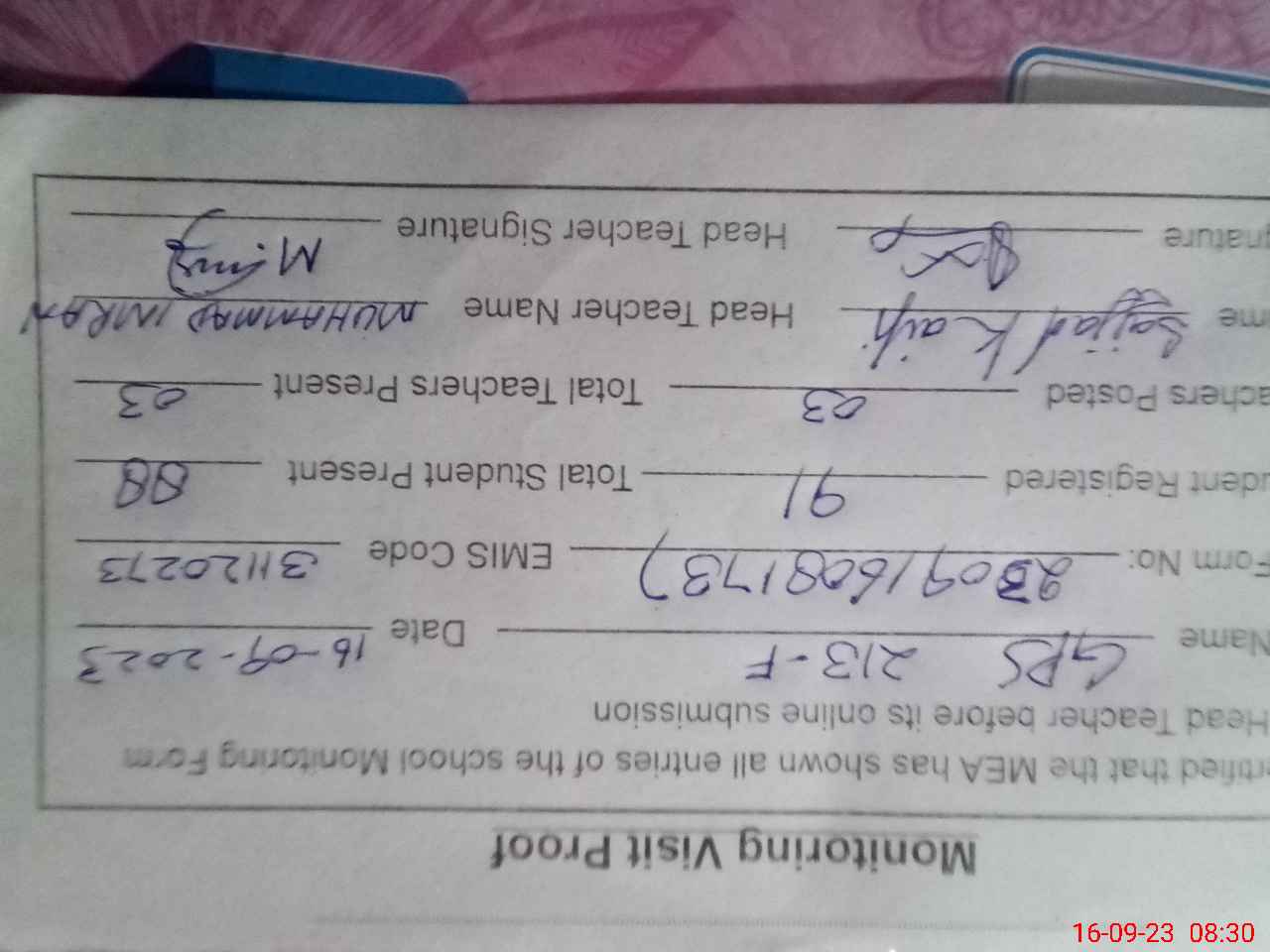 | Name: MU**** IM**** Designation: (School Headmaster's/Headmistress's) Pst Phone/Cell Number: 03**** |