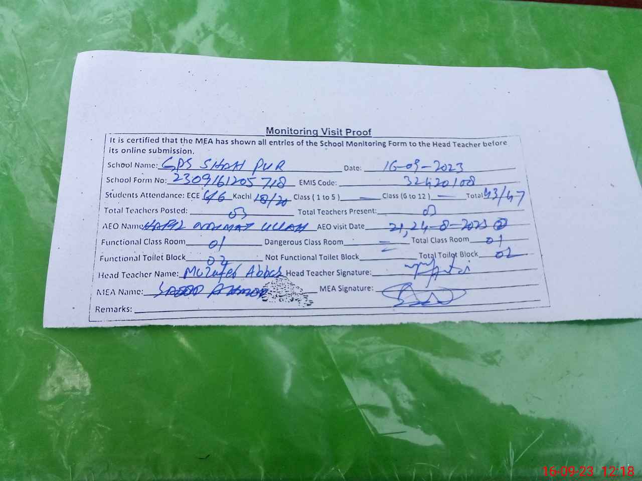 | EMIS Code: 32420108 | Name of School: GPS SHAH PUR | |||