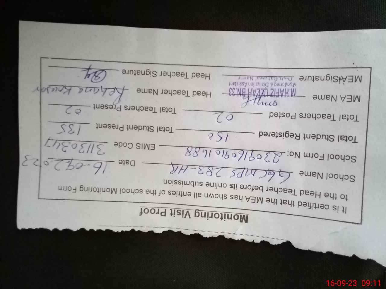 | Monitoring Date: 16-09-2023 | Start Time: 16-09-2023 08:50 AM | End Time: 16-09-2023 09:13 AM | Name of MEA: Mu**** Ha**** BN**** | |