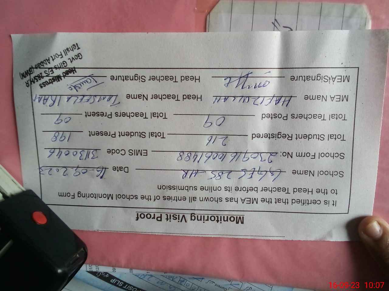 | Certified that this School was Inspected by the Undersigned MEA/DMO Today and the Information Stated Above is as Per Record. | |||||
