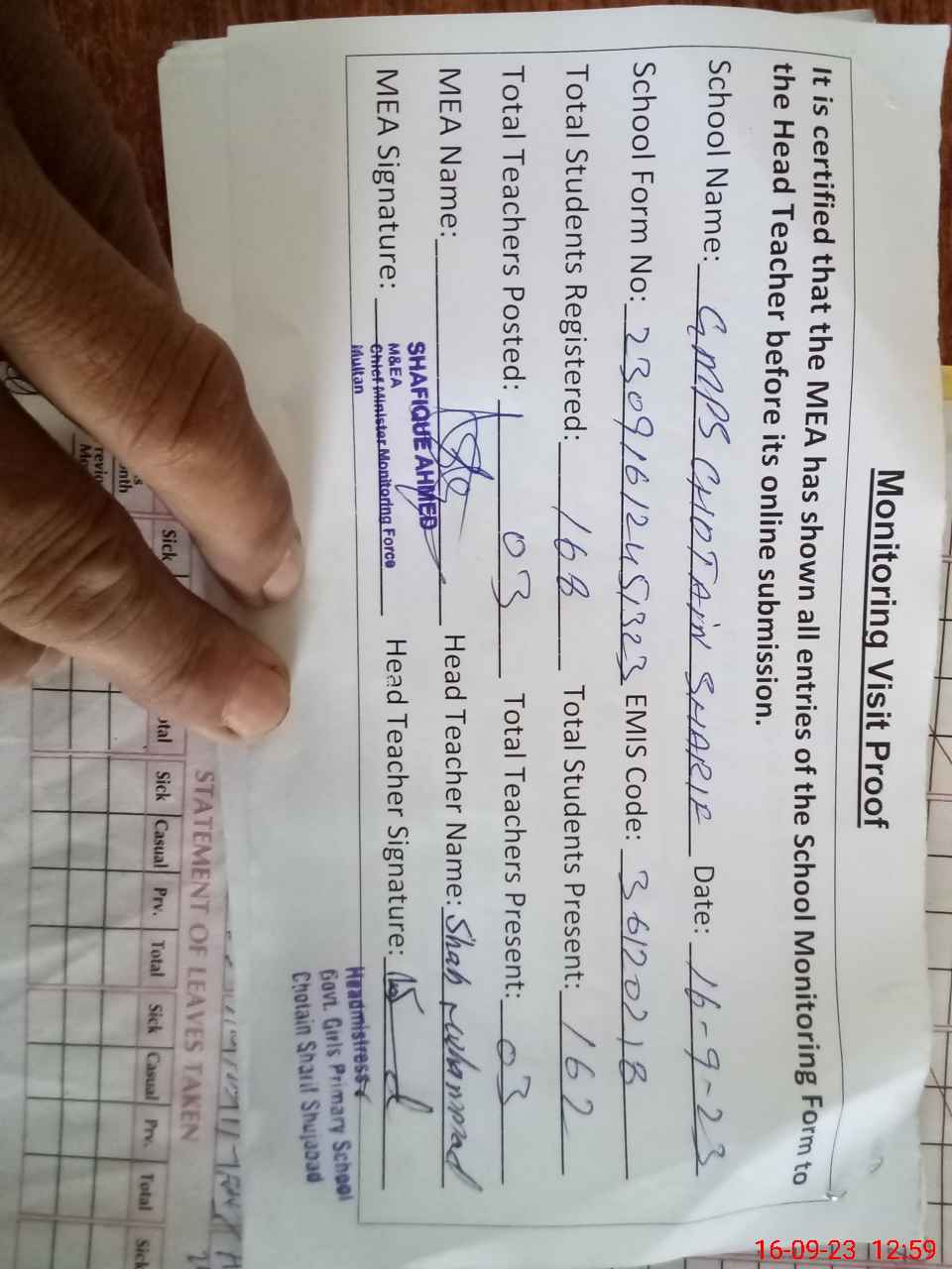 | Attendance Register | Head Teacher | MEA with School | Visit Proof |