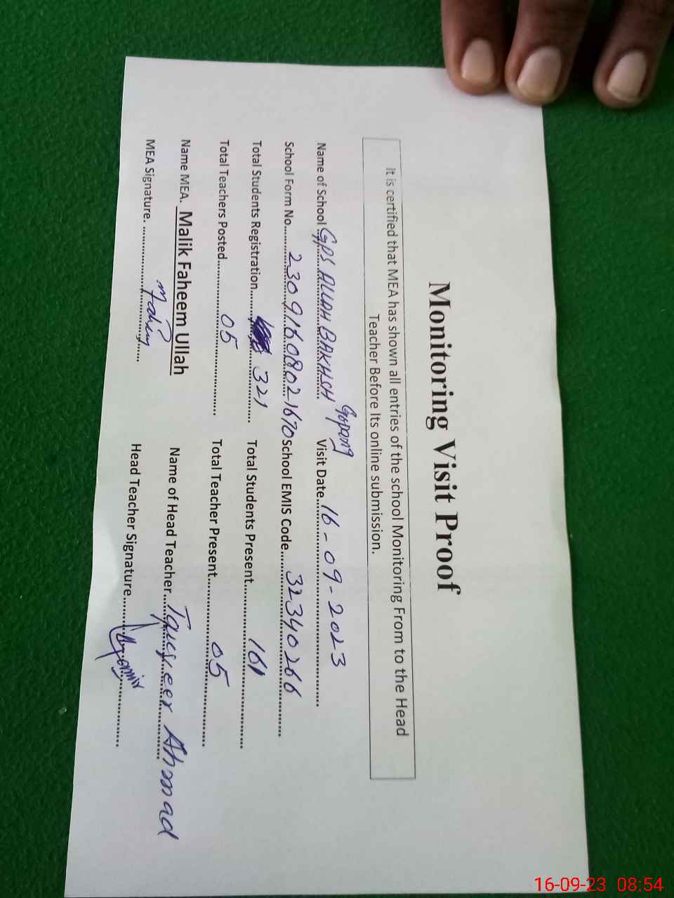 | Attendance Register | Head Teacher | MEA with School | Visit Proof |