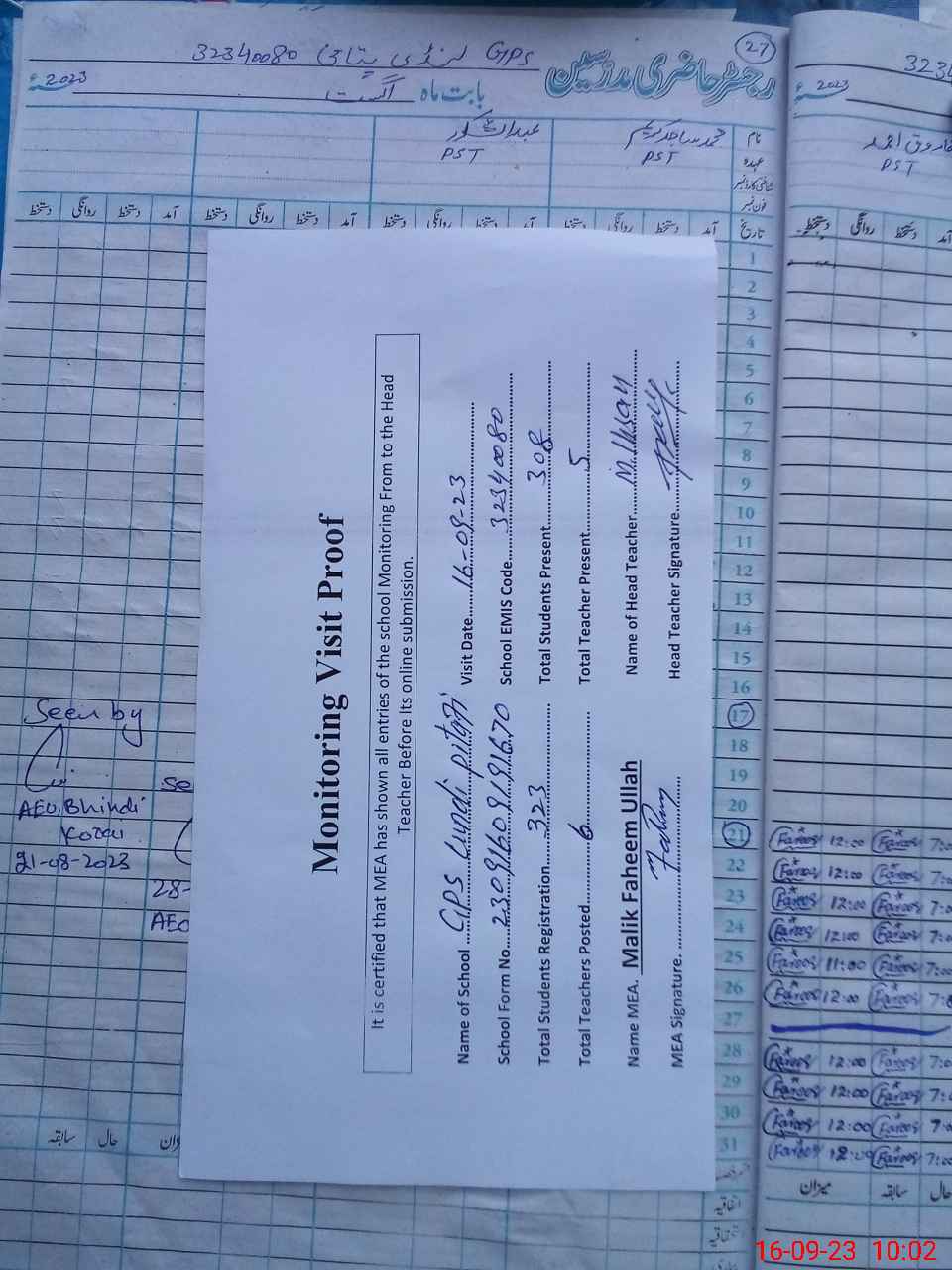 | Attendance Register | Head Teacher | MEA with School | Visit Proof |