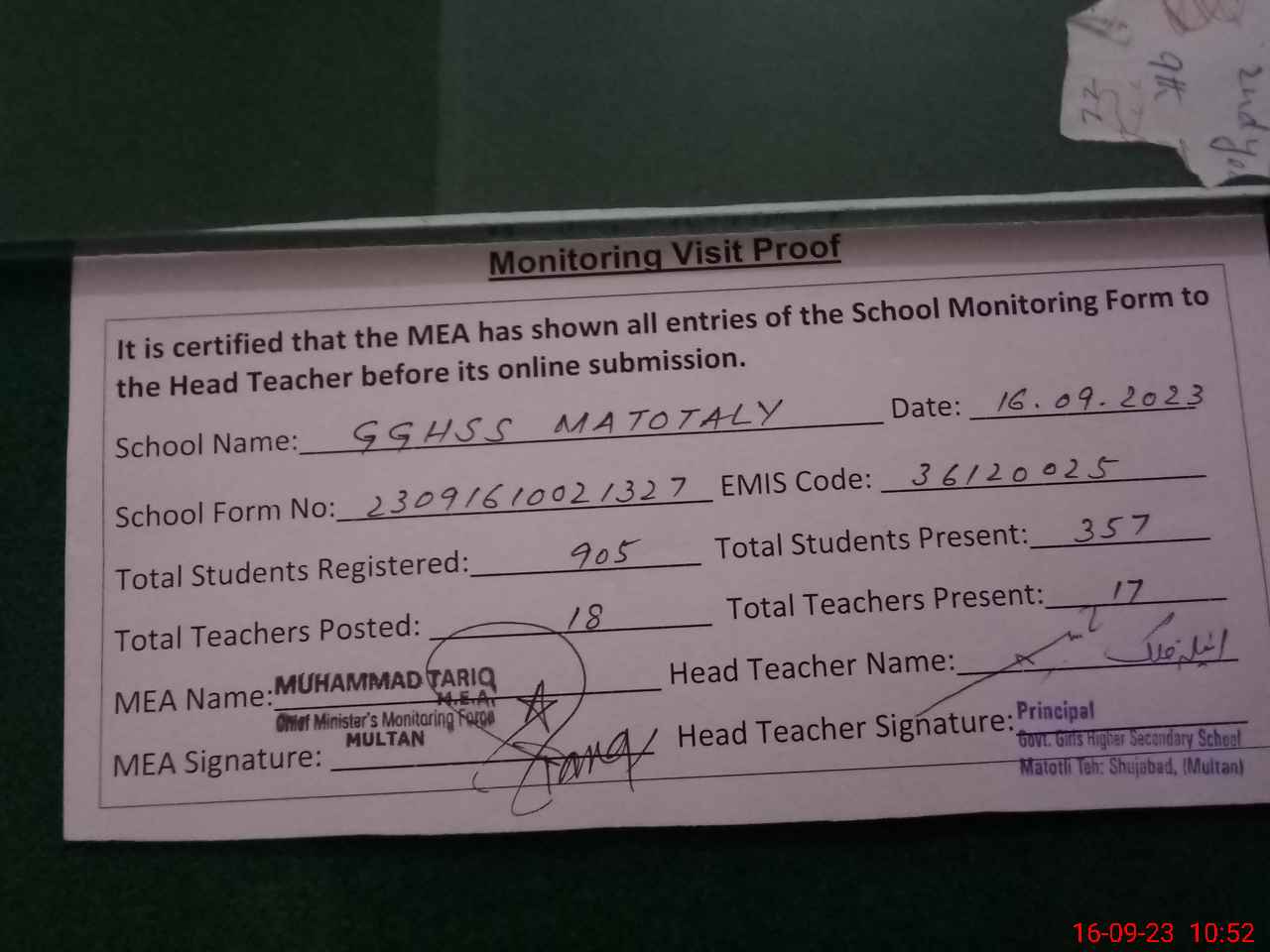 | EMIS Code: 36120025 | Name of School: GGHSS MATOTLY SHUJABAD | |||