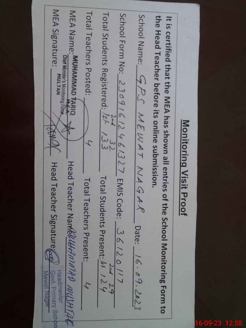 | Attendance Register | Head Teacher | MEA with School | Visit Proof |