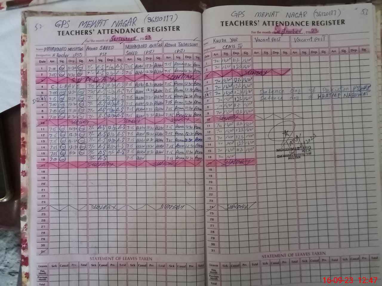 | Remarks (Use Separate Page if Required): STUDENTS ATTENDENCE LIST OF PREVIOUS SESSION LND COULD NOT CONDUCTED AS CLASSES PACKED UP DUE TO SCHOOL HAS AFTERNOON SHIFT | |||||