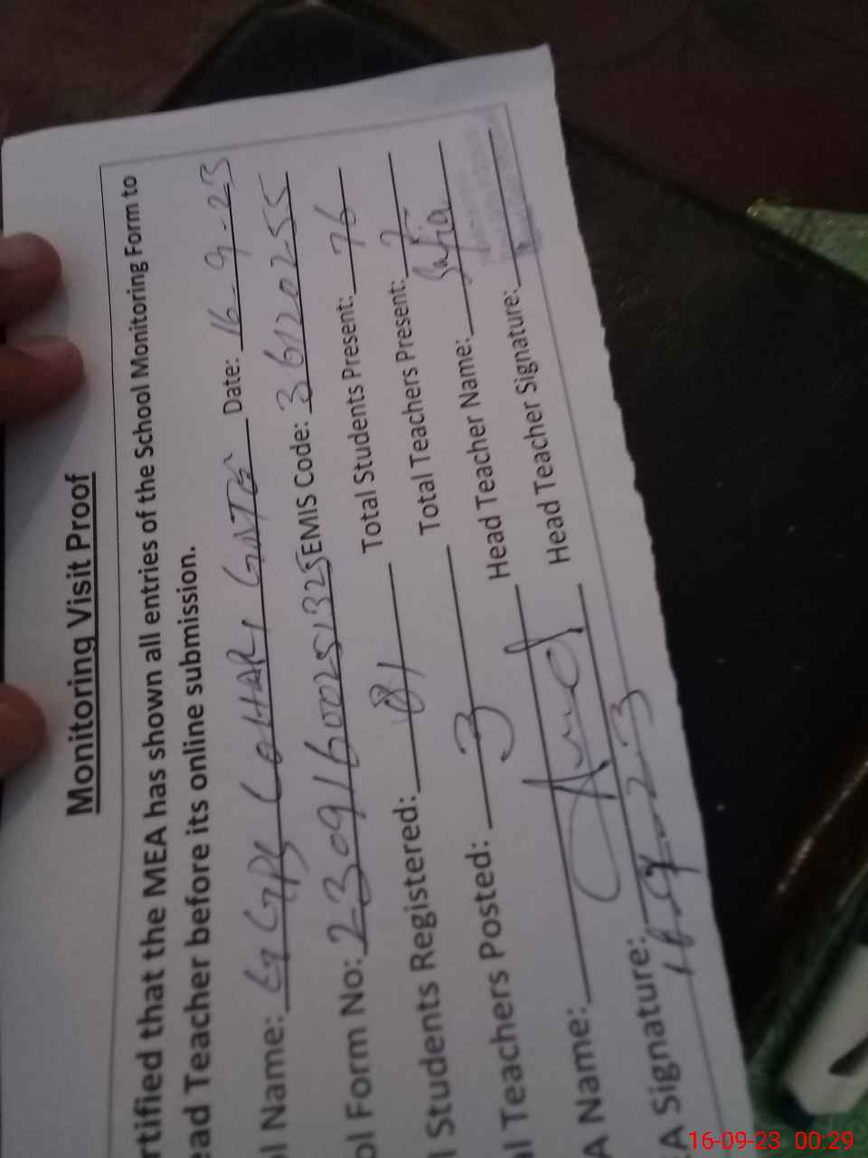 | Attendance Register | Head Teacher | MEA with School | Visit Proof |