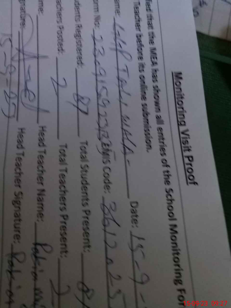 | Attendance Register | Head Teacher | MEA with School | Visit Proof |