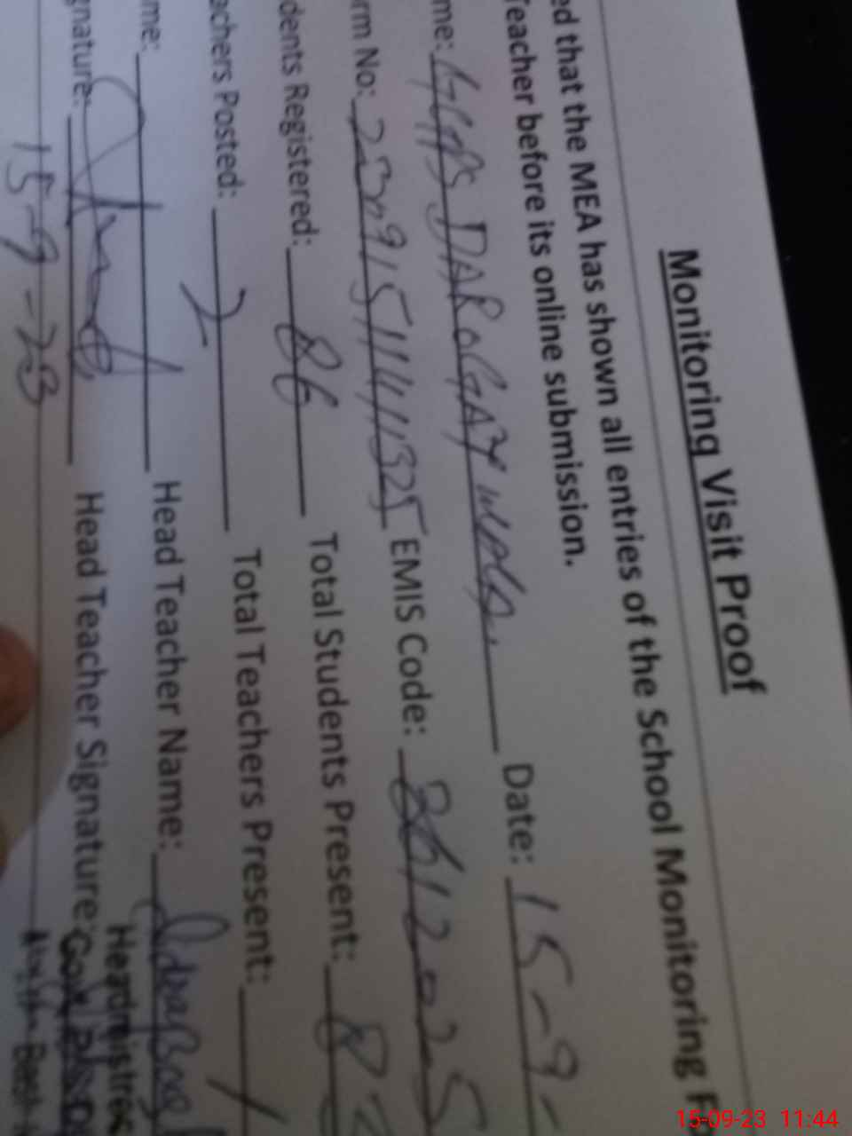 | Attendance Register | Head Teacher | MEA with School | Visit Proof |