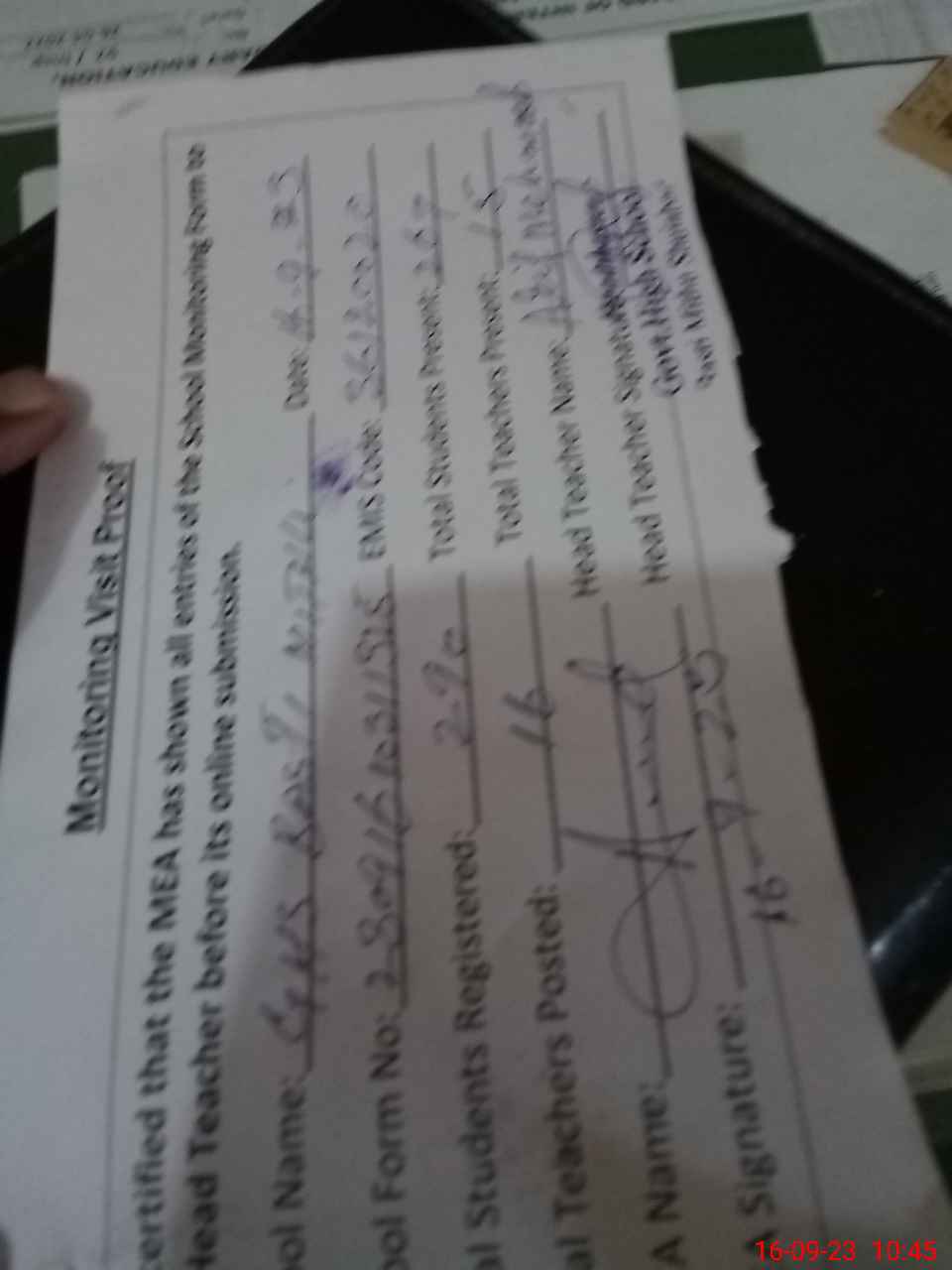 | Attendance Register | Head Teacher | MEA with School | Visit Proof |