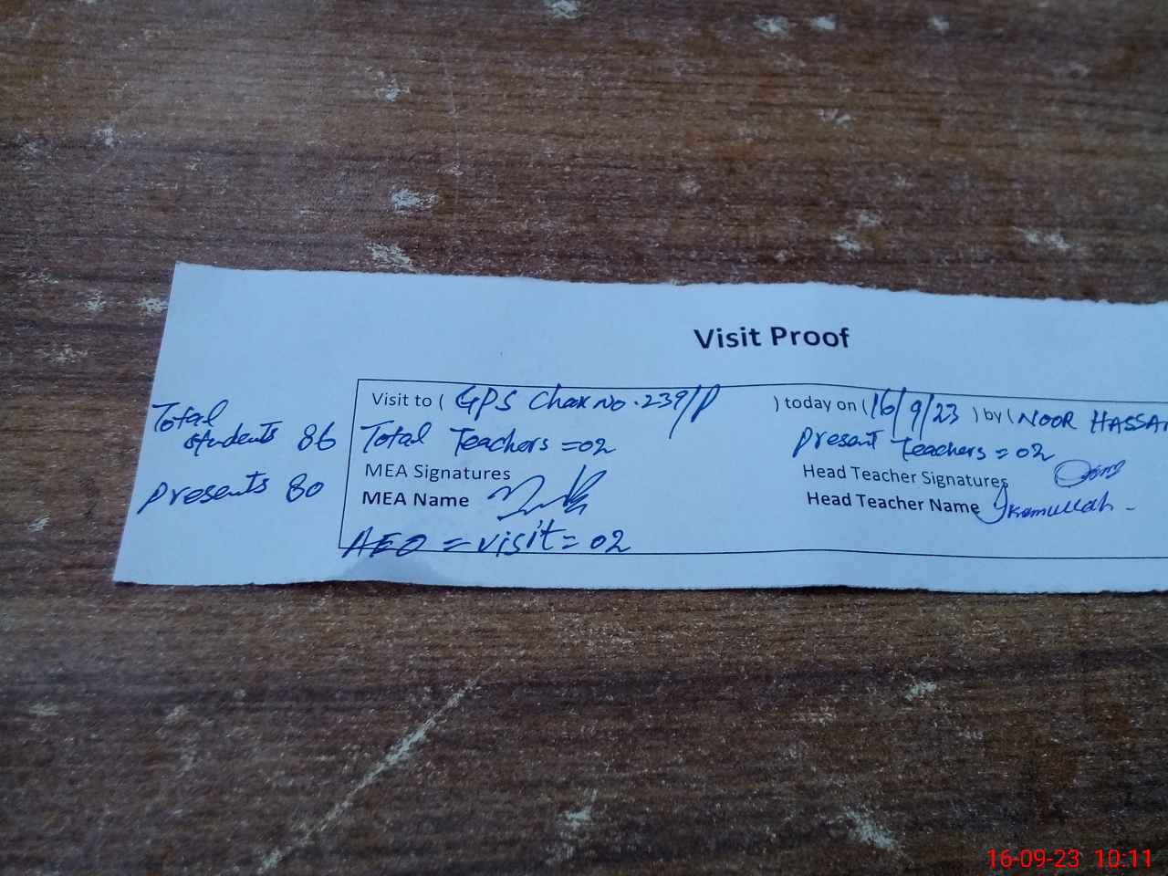| Attendance Register | Head Teacher | MEA with School | Visit Proof |