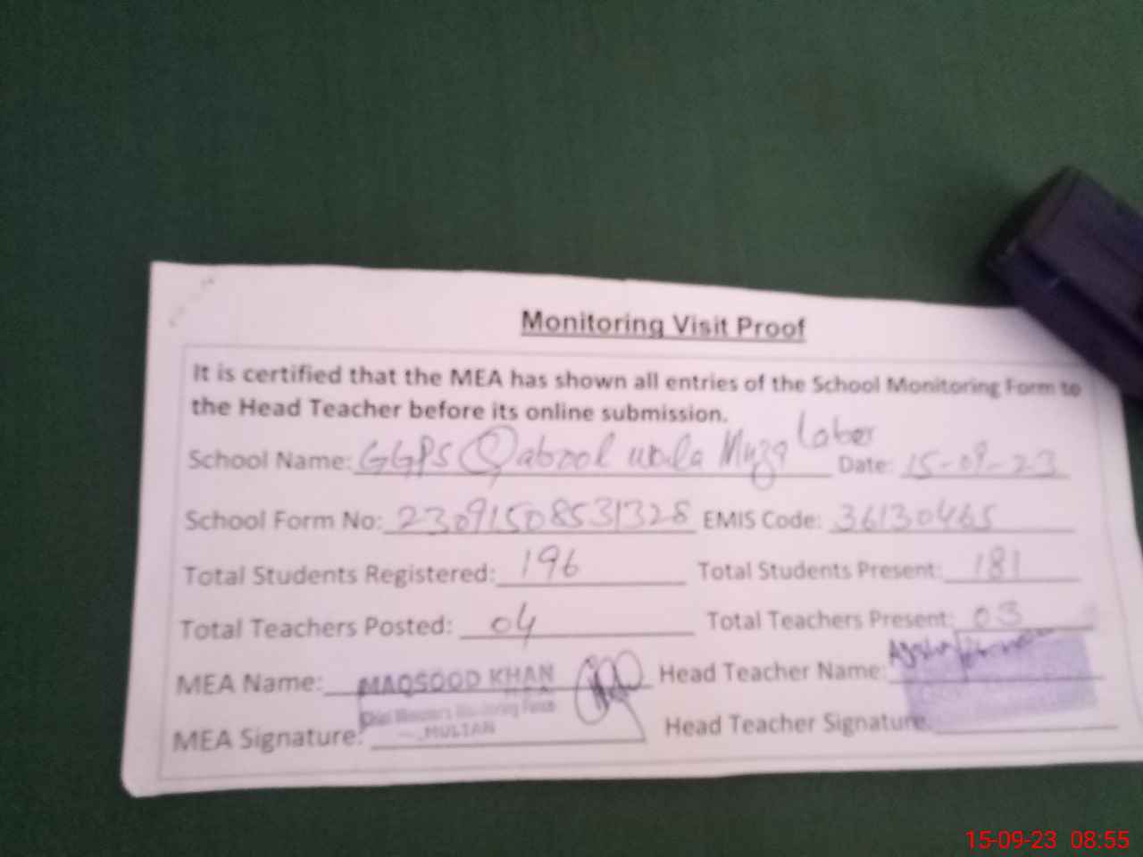 | Attendance Register | Head Teacher | MEA with School | Visit Proof |