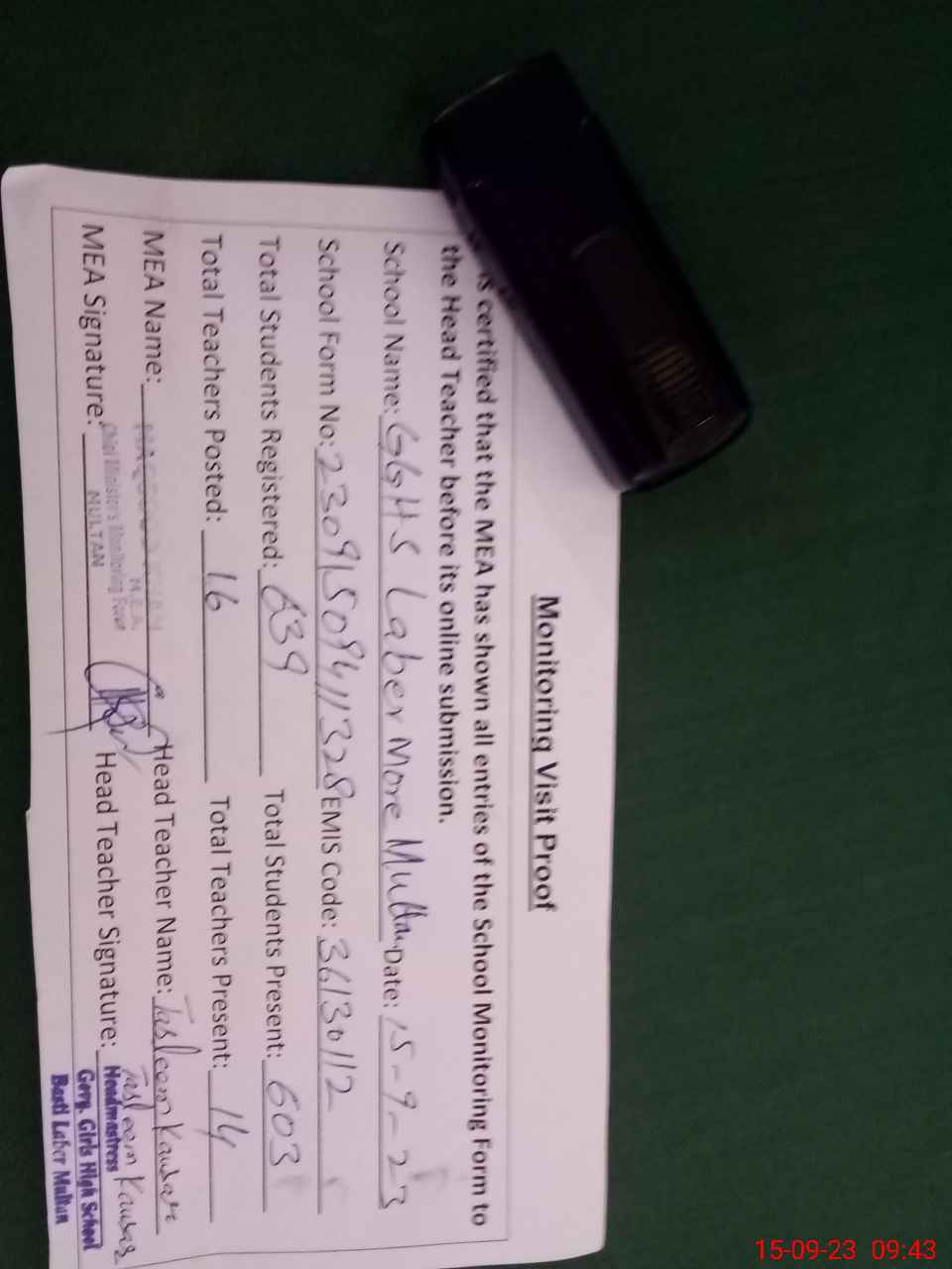| Monitoring Date: 15-09-2023 | Start Time: 15-09-2023 09:31 AM | End Time: 15-09-2023 09:44 AM | Name of MEA: MA**** ULHA**** KH**** | |