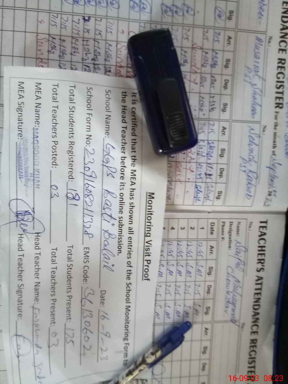 | Attendance Register | Head Teacher | MEA with School | Visit Proof |