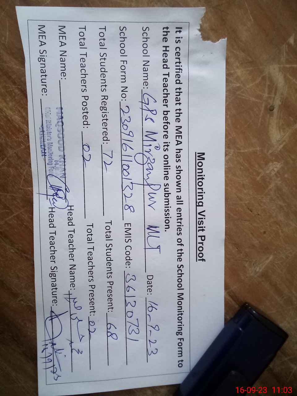 | Attendance Register | Head Teacher | MEA with School | Visit Proof |