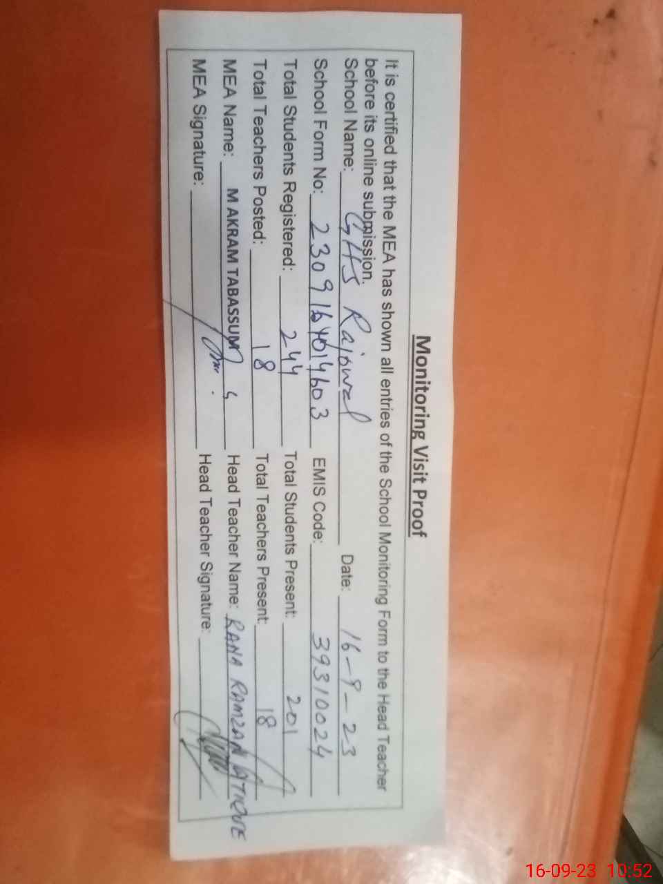 | Attendance Register | Head Teacher | MEA with School | Visit Proof |