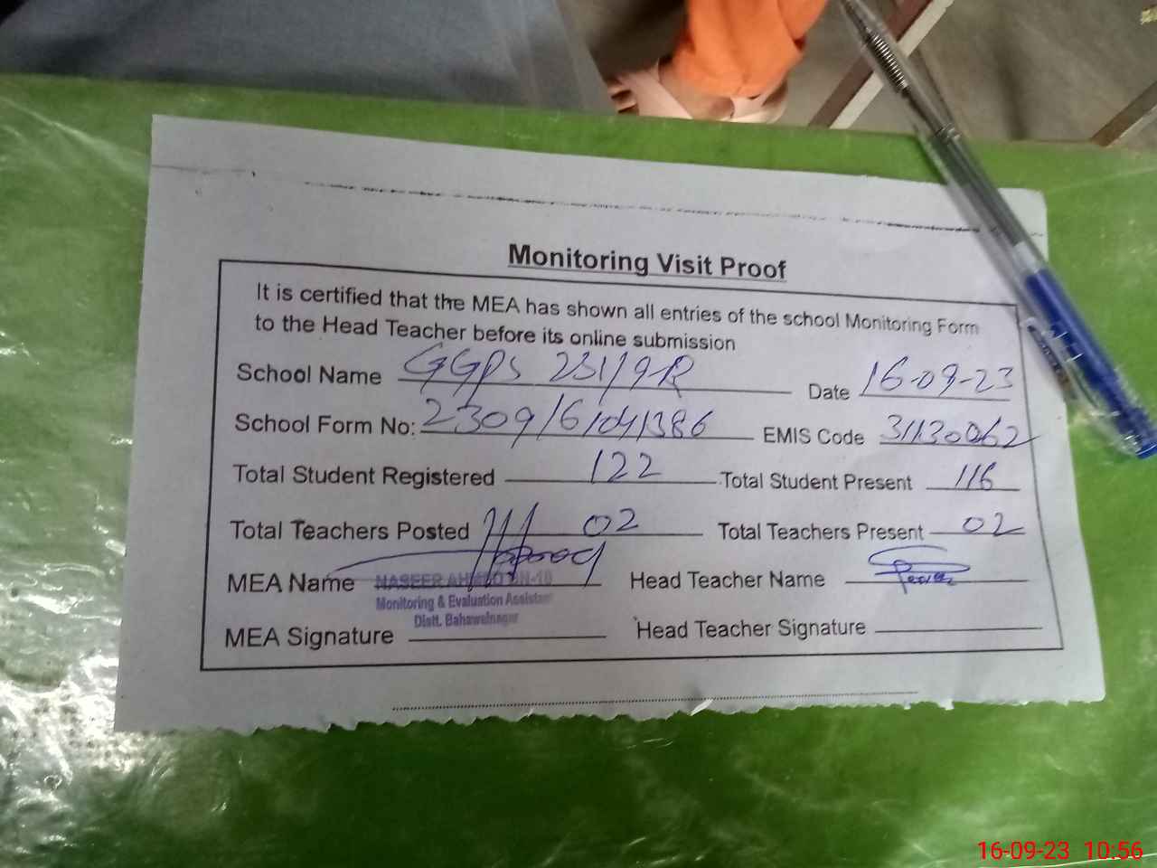 | Attendance Register | Head Teacher | MEA with School | Visit Proof |