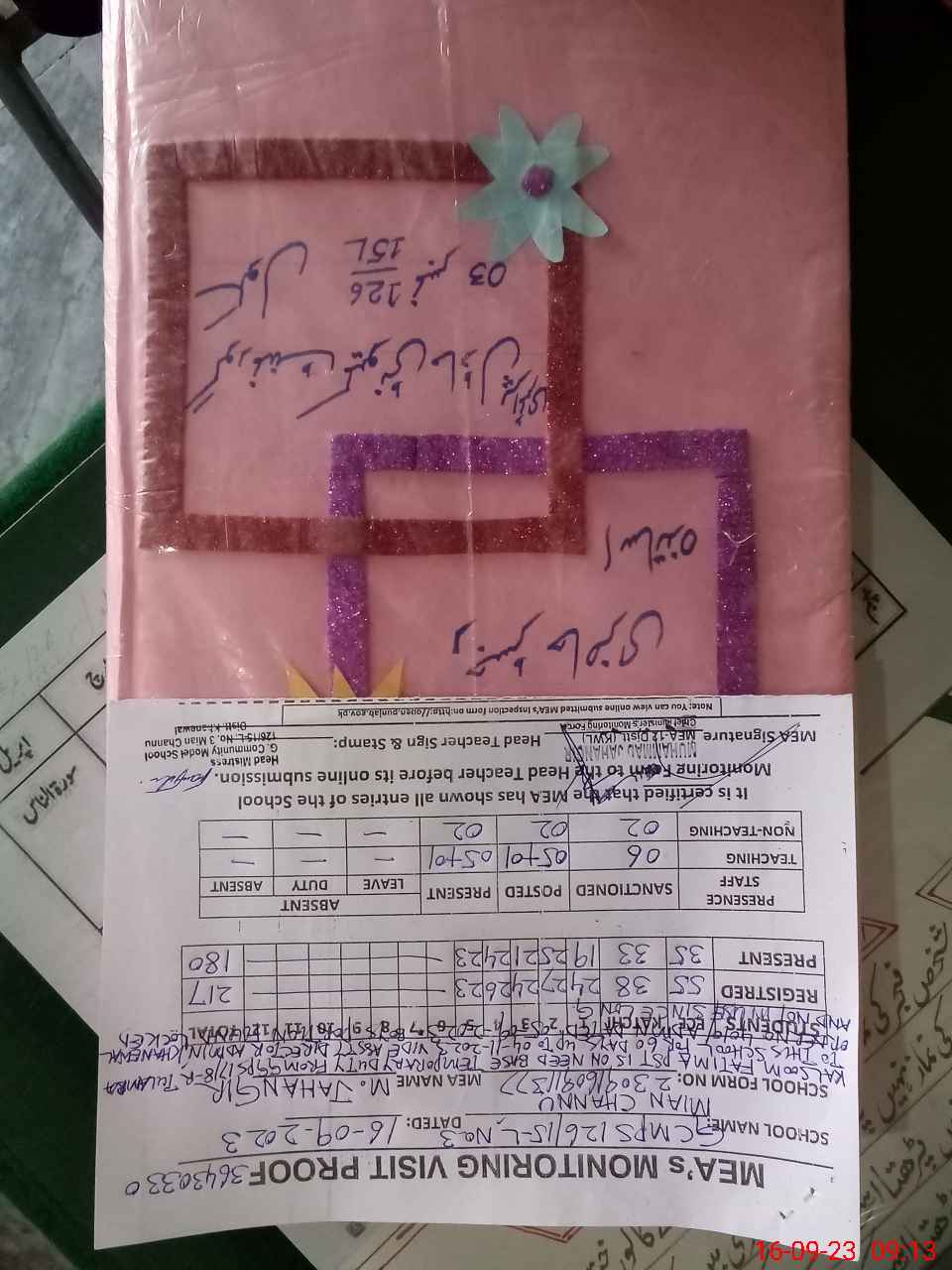 | Remarks (Use Separate Page if Required): KALSOOM AKHTAR PST IS ON NEED BASE TEMPORARY DUTY FROM GGPS 17 8R TULAMBA TO THIS SCHOOL FOR 60 DAYS UPTO 04 NOVEMBER 2023 VIDE ASSTT DIRECTOR ADMIN KHANEWAL ORDER NO 4010 ADMN DATED 05 SEPTEMBER 2023 SCHOOL IS CONSOLIDATED BOYS PORTION CONSISTING ON FOUR CLASS ROOMS AND TWO TOILETS FOUND LOCKED AND NOT IN USE SINCE LONG RANDOM CLASS KATCHI IS NOW IN CLASS ONE AND TWO | |||||