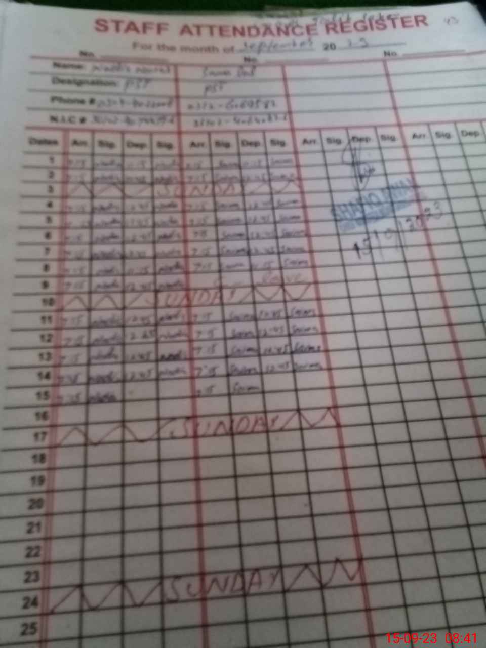 | CNIC | Full Name | Designation | R/C | Absence During Last Calender Month |