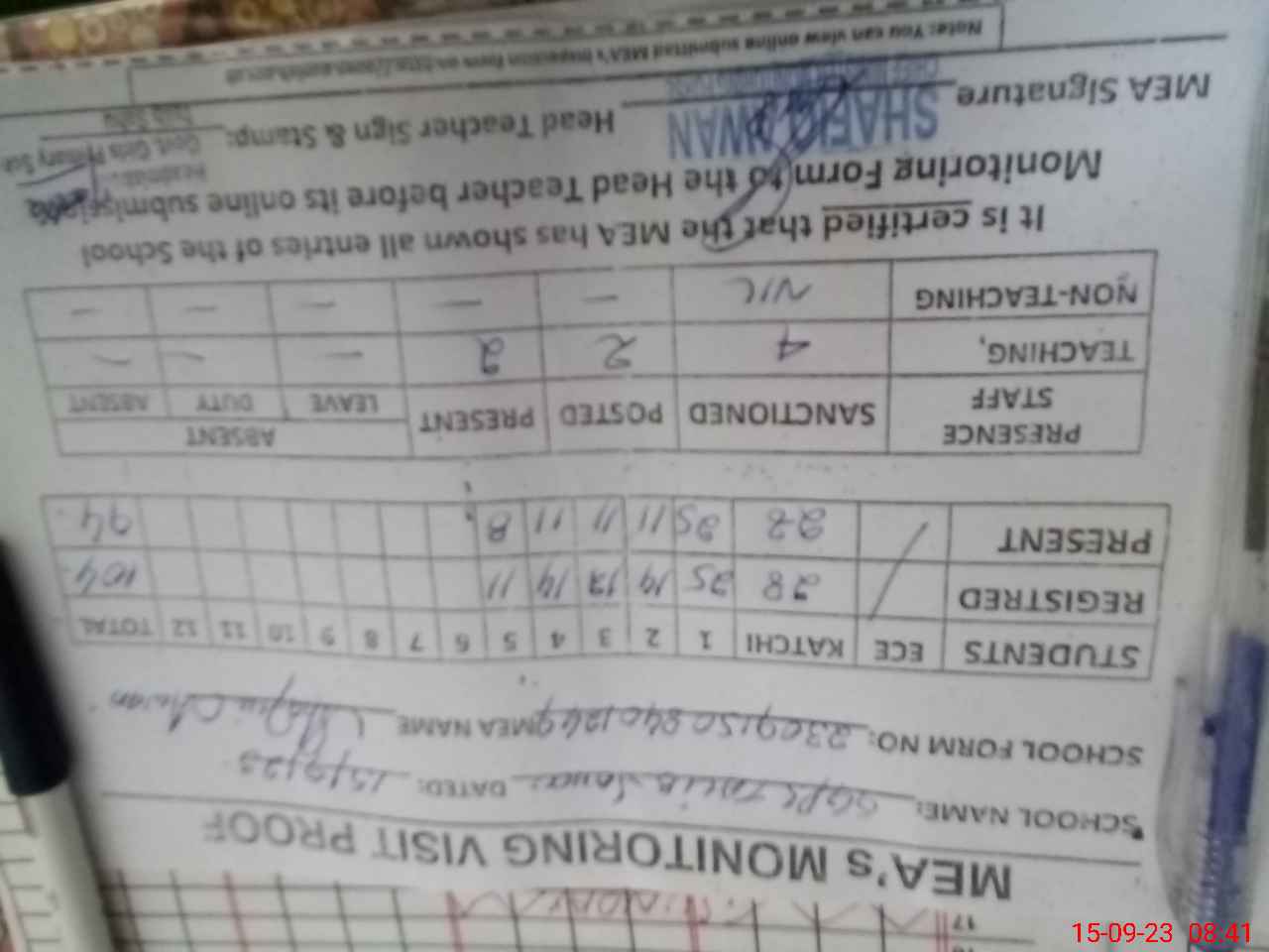 | Attendance Register | Head Teacher | MEA with School | Visit Proof |