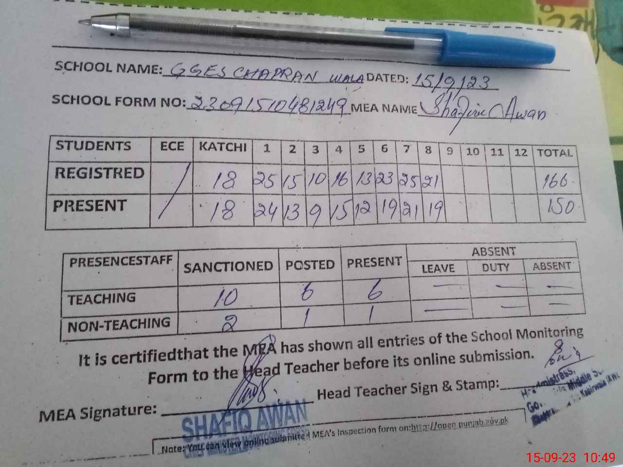 | Certified that this School was Inspected by the Undersigned MEA/DMO Today and the Information Stated Above is as Per Record. | |||||