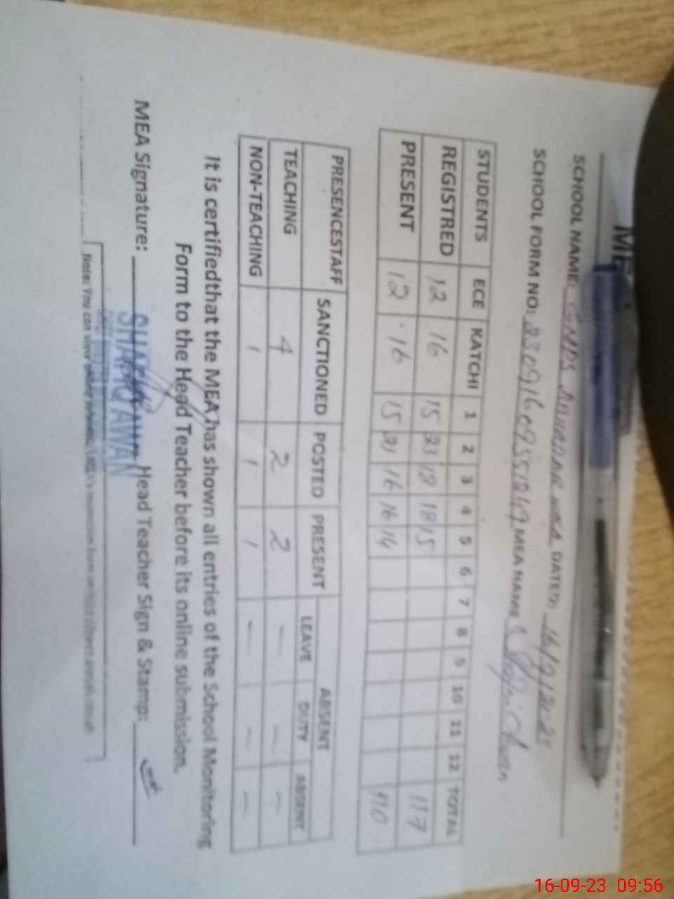 | Attendance Register | Head Teacher | MEA with School | Visit Proof |