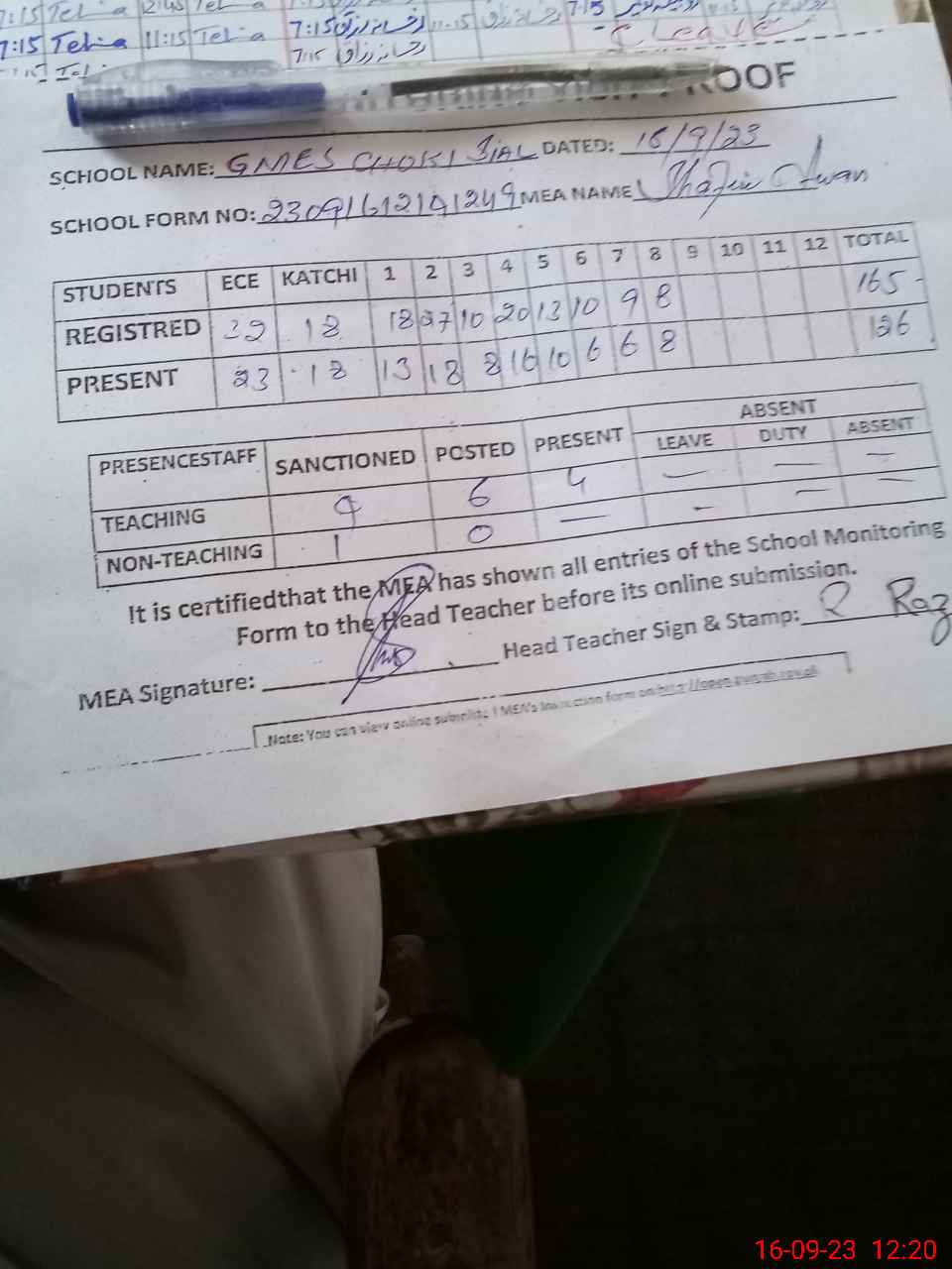 | Attendance Register | Head Teacher | MEA with School | Visit Proof |