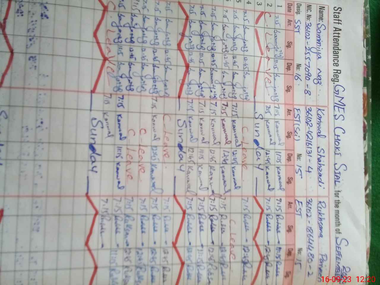 | CNIC | Full Name | Designation | R/C | Absence During Last Calender Month |