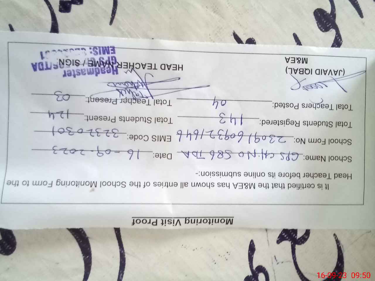 | Name: Sh**** Ma**** Designation: (School Headmaster's/Headmistress's) PstEScience Phone/Cell Number: 03**** |