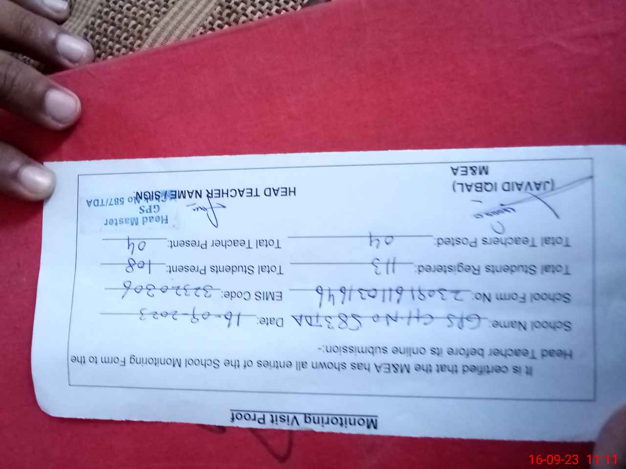 | Certified that this School was Inspected by the Undersigned MEA/DMO Today and the Information Stated Above is as Per Record. | |||||