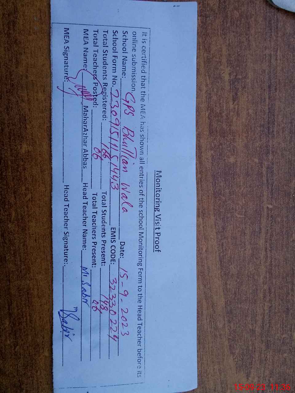 | Attendance Register | Head Teacher | MEA with School | Visit Proof |