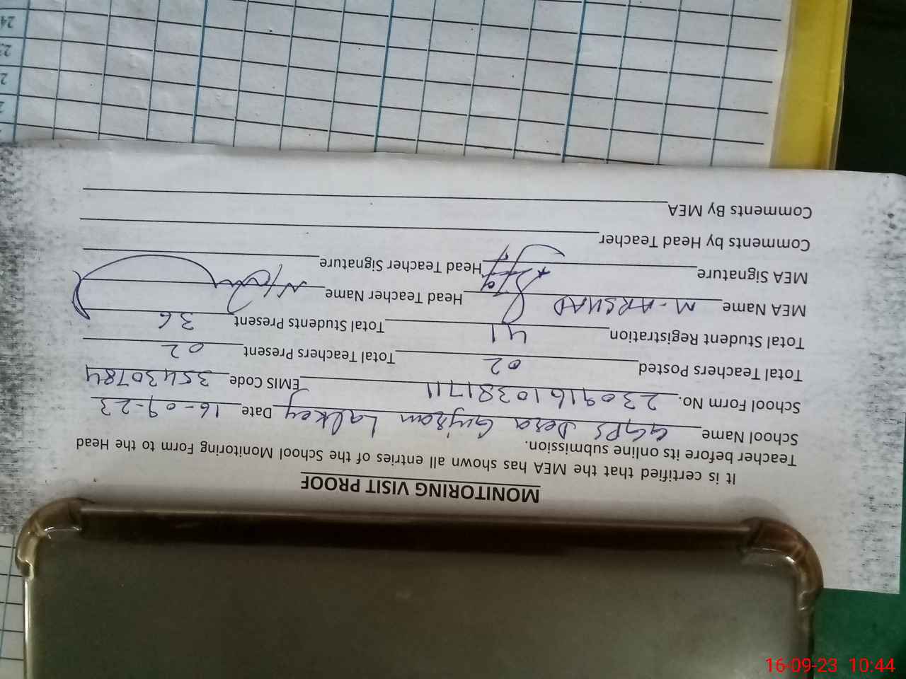 | Attendance Register | Head Teacher | MEA with School | Visit Proof |