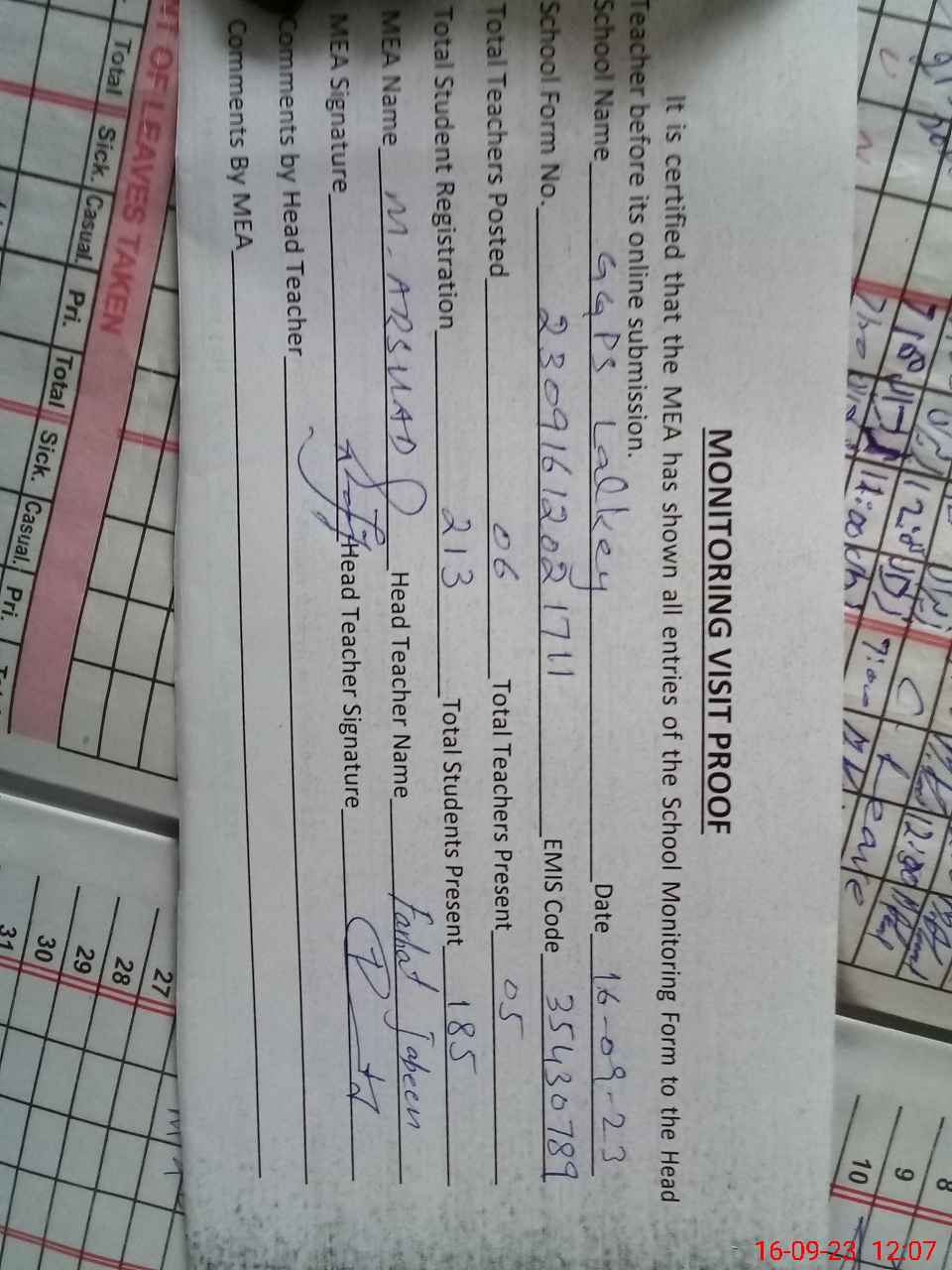 | Attendance Register | Head Teacher | MEA with School | Visit Proof |