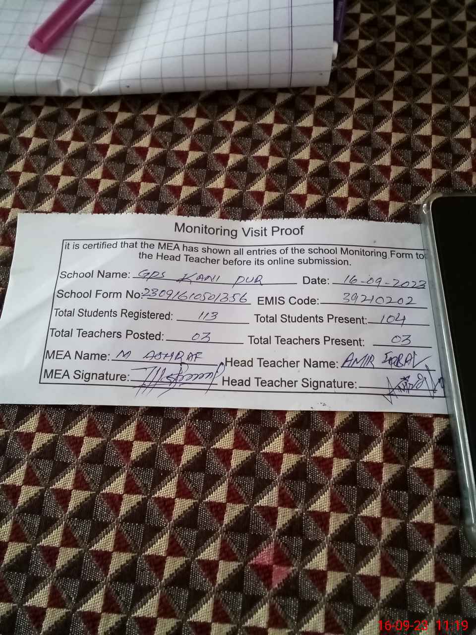 | EMIS Code: 39210202 | Name of School: GPS KANI PUR PO KUMAHARI WALA | |||
