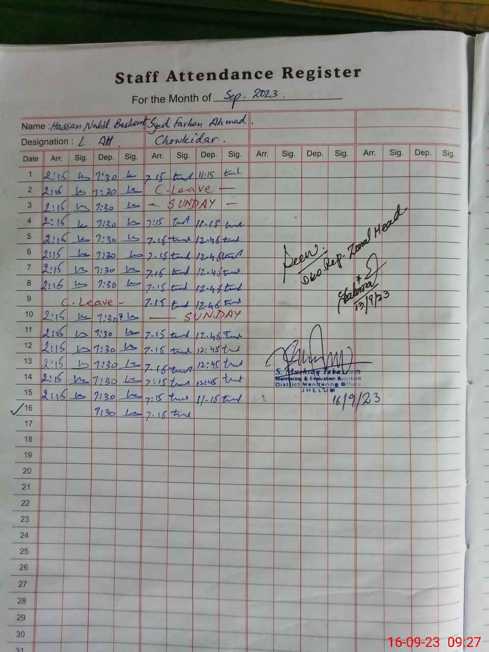 | CNIC | Full Name | Designation | R/C | Absence During Last Calender Month |
