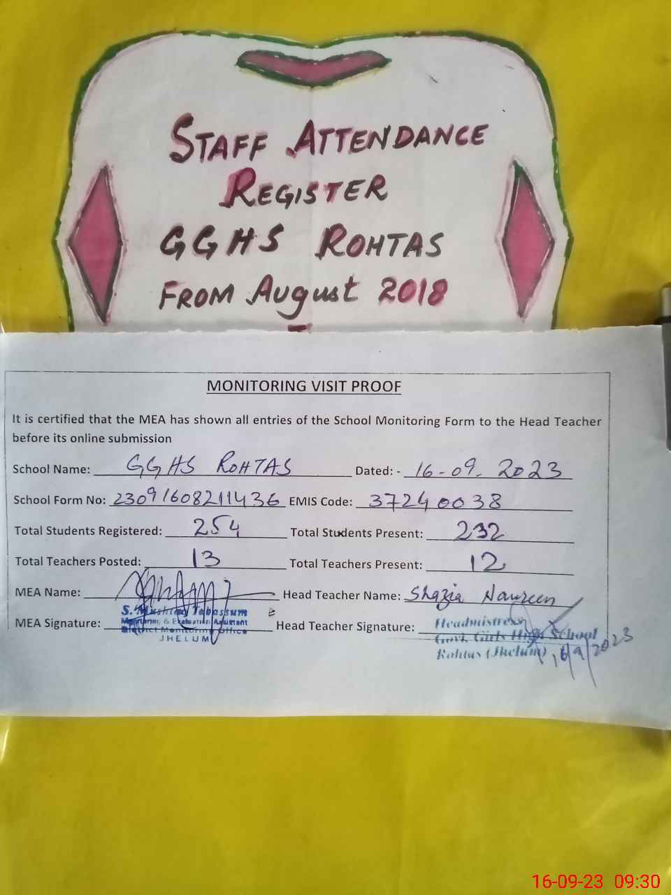 | Attendance Register | Head Teacher | MEA with School | Visit Proof |