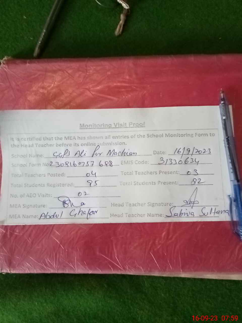 | Attendance Register | Head Teacher | MEA with School | Visit Proof |