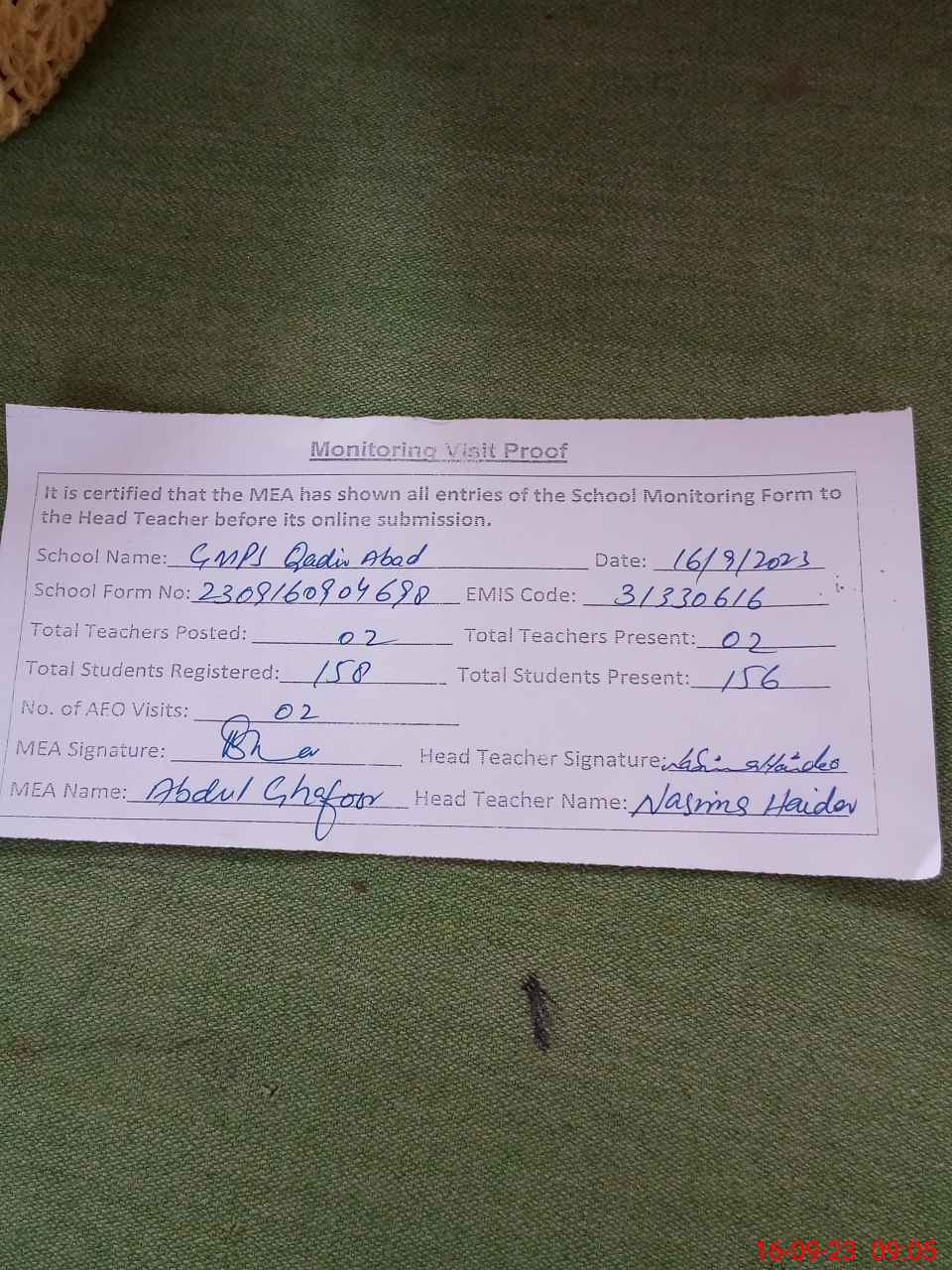 | EMIS Code: 31330616 | Name of School: GMPS QADIR ABAD BASTI | |||