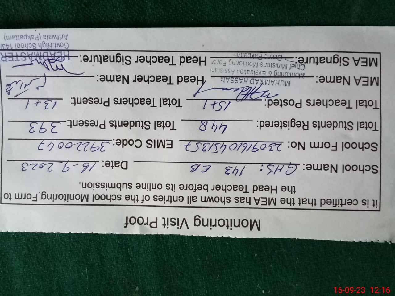 | Certified that this School was Inspected by the Undersigned MEA/DMO Today and the Information Stated Above is as Per Record. | |||||