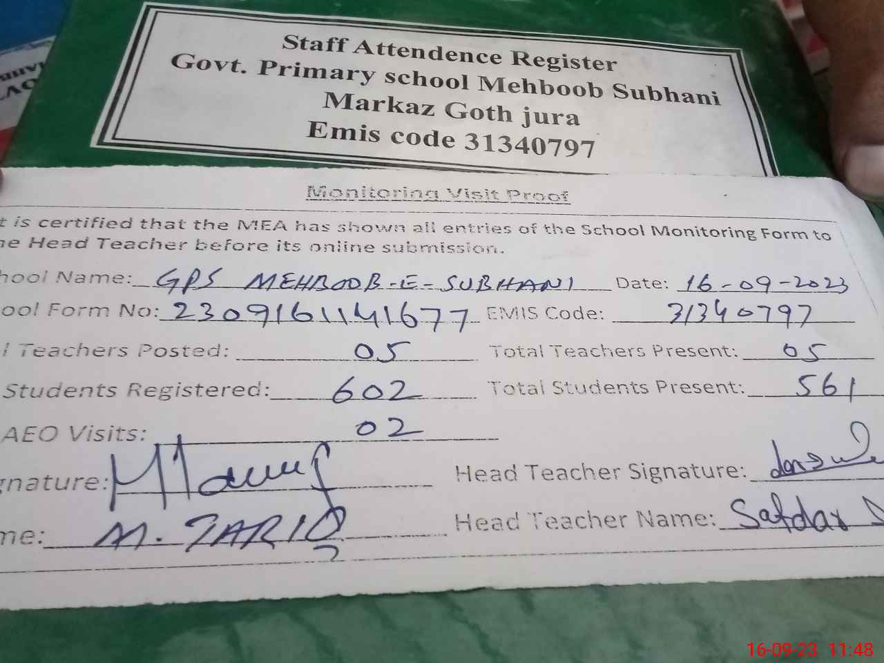 | Attendance Register | Head Teacher | MEA with School | Visit Proof |