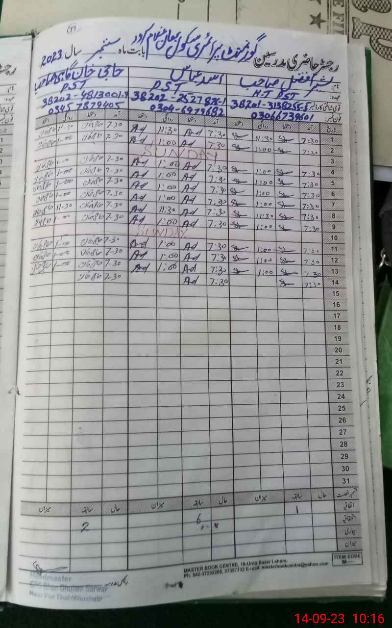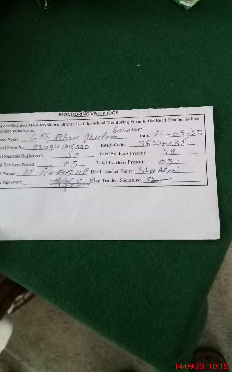 | EMIS Code: 38220035 | Name of School: GPS BHAN GHULAM SARWAR | |||