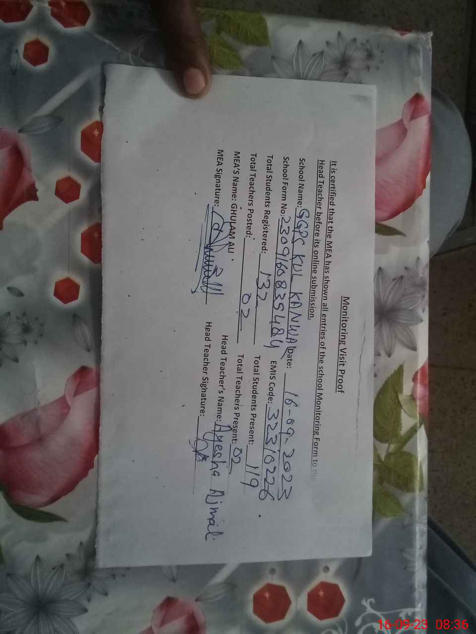 | Attendance Register | Head Teacher | MEA with School | Visit Proof |