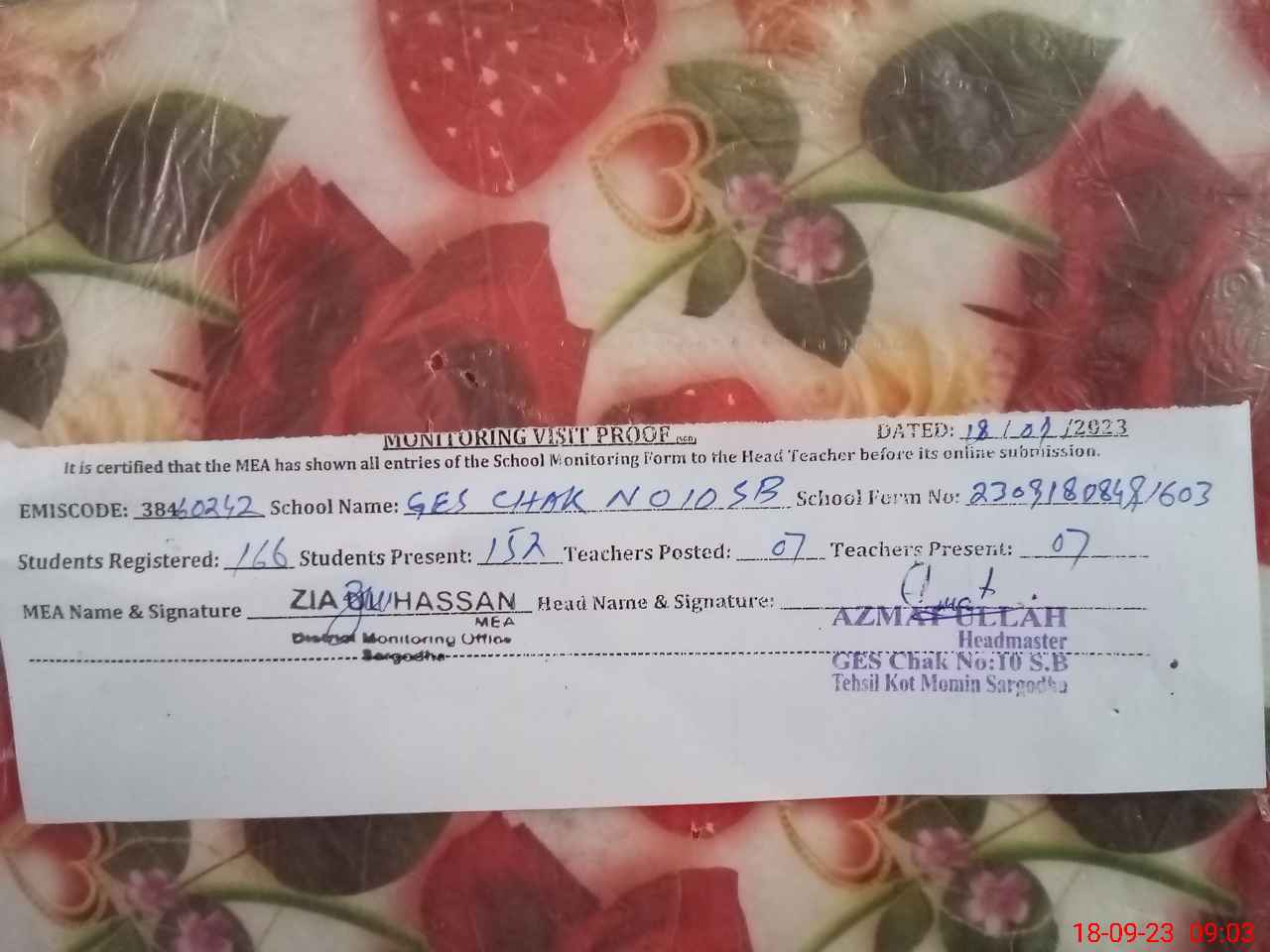 | Attendance Register | Head Teacher | MEA with School | Visit Proof |