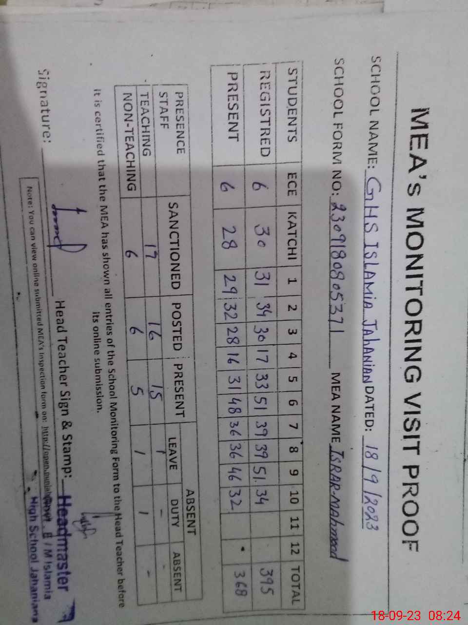 | Attendance Register | Head Teacher | MEA with School | Visit Proof |