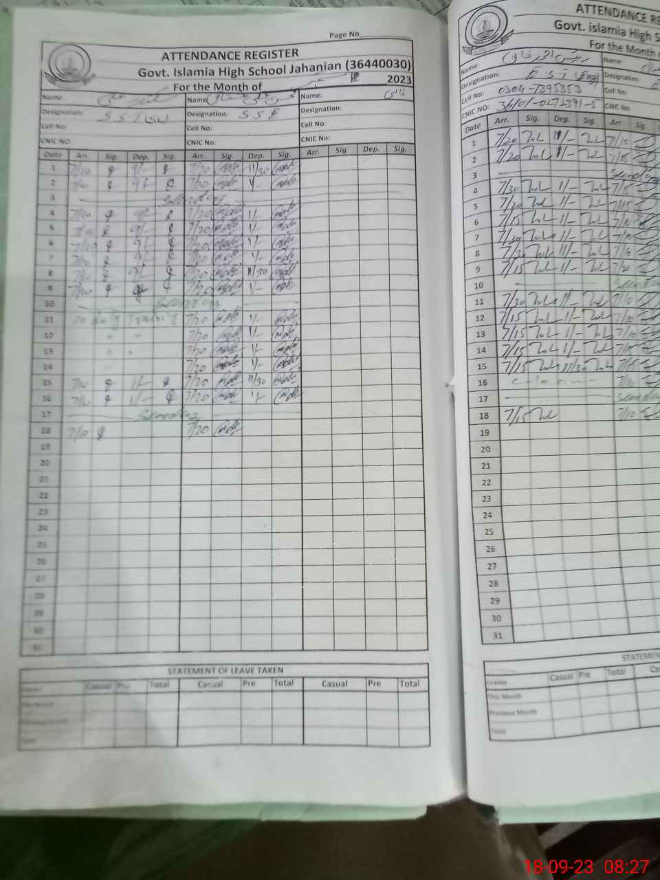 | CNIC | Full Name | Designation | R/C | Absence During Last Calender Month |