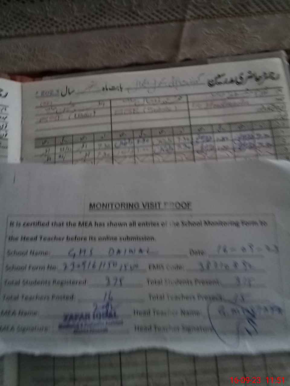 | Attendance Register | Head Teacher | MEA with School | Visit Proof |
