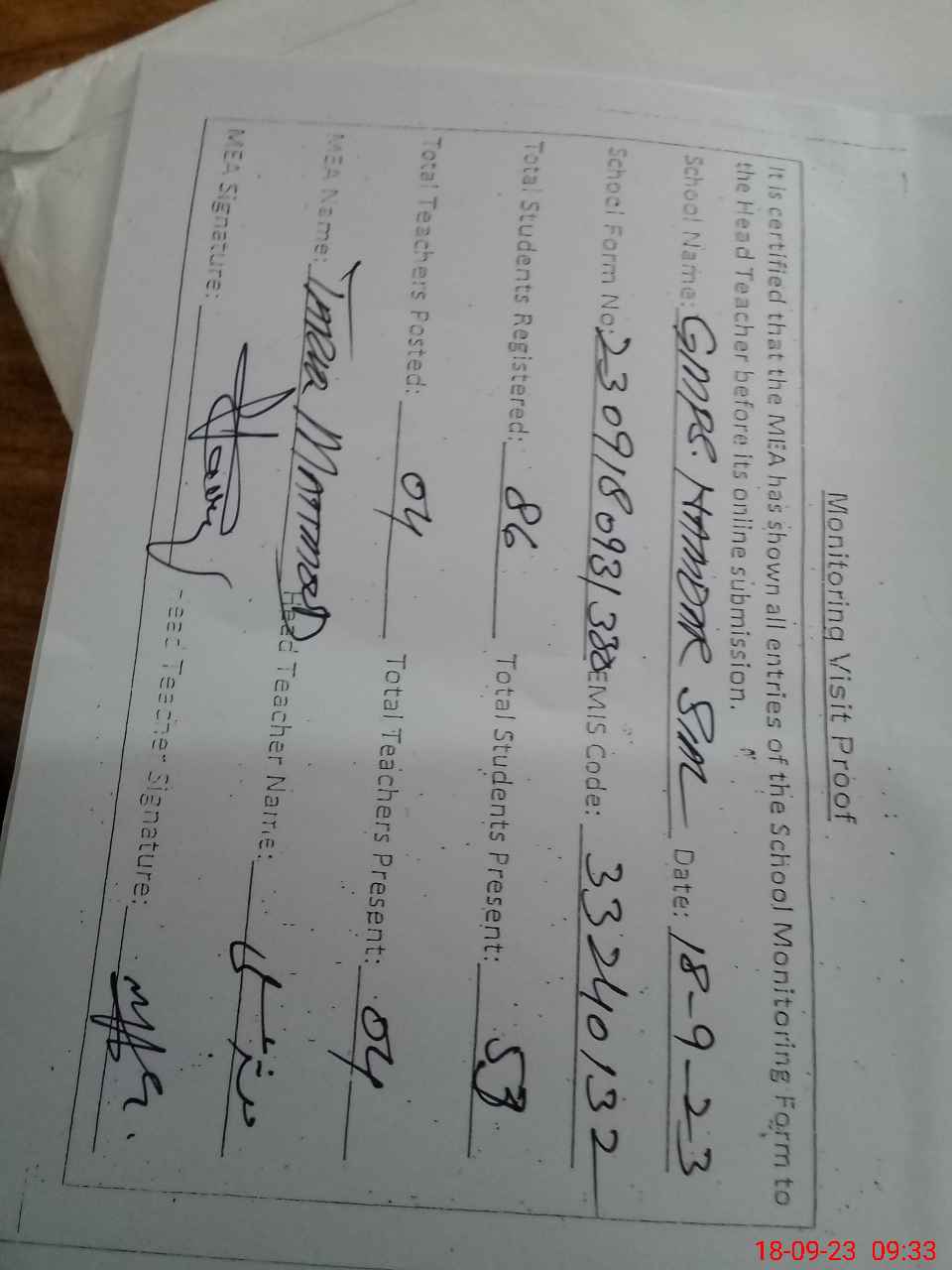 | Attendance Register | Head Teacher | MEA with School | Visit Proof |
