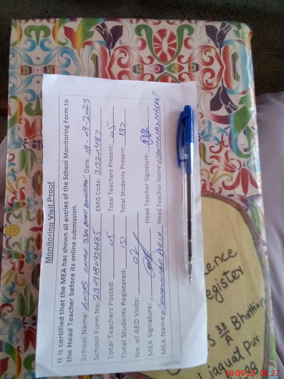 | Attendance Register | Head Teacher | MEA with School | Visit Proof |